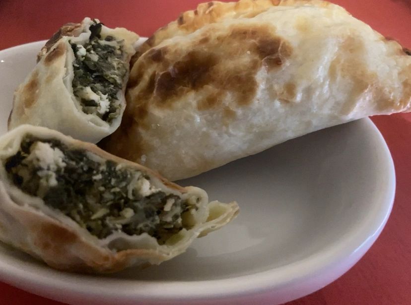 Sautee spinach, sauteed onions goat-feta cheese and raisins.